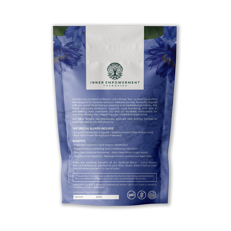 Introducing our Spiritual Blend-Lotus Flower spiritual blend flowers - a carefully crafted tea designed to complement your wellness journey. Perfectly aligned with our sound bowl therapy sessions and meditative practices, this blend enhances relaxation, supports lucid dreaming, and aids in manifesting your intentions. It's also an excellent companion for reducing anxiety and deepening your meditation experience. Our lotus flowers are organically sourced and lovingly farmed to preserve their purity and potency.